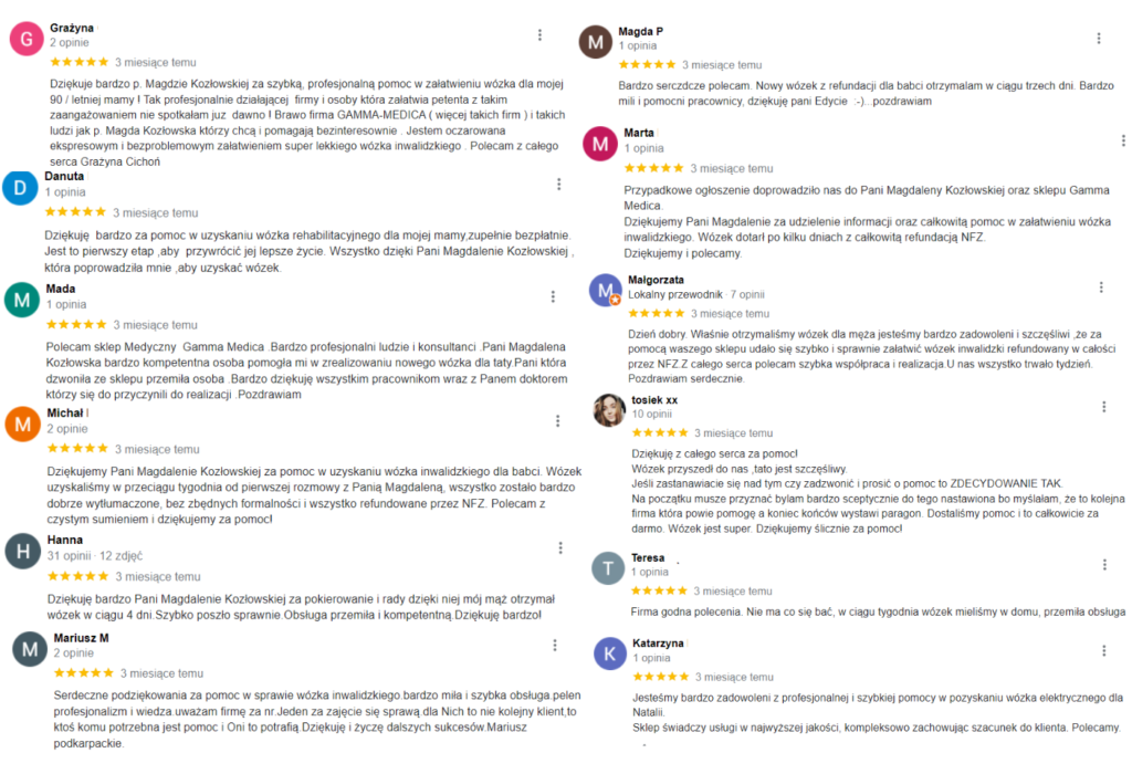 Opublikowano na HarleyTrustindex sprawdza, czy pierwotnym źródłem recenzji jest Google. Coś wspaniałego i w dzisiejszych czasach aż niemożliwego a jednak...ogłoszenie o darmowych wózkach dla mnie oznaczało "bądź ostrożna". Telefon od pani Edyty Rabiej rozwiał moje wątpliwości w 99% ale gdy przyszło kolejne potwierdzenie o przygotowaniu wózka do wysyłki, mało nie spadłam z krzesła! 8 dni i Tata po udarze oraz przy RZS ma swój własny wózek inwalidzki o podwyższonym komforcie użytkowania:) Szczere DZIĘKUJĘ! To wydarzyło się naprawdę. Koszt wózka 4000 zł całkowicie dofinansowany z NFZ:)Opublikowano na Jarosław MaTrustindex sprawdza, czy pierwotnym źródłem recenzji jest Google. Uzyskanie sprzętu z refundacją dla osoby potrzebującej, profesjonalnie, szybko i z empatią do osoby. Dziękuję bardzo i polecam Panią JolantęOpublikowano na Hanna DettlaffTrustindex sprawdza, czy pierwotnym źródłem recenzji jest Google. Świetna obsługa. Szybko przesłany wózek bez jakichkolwiek kosztów. Dziękuję bardzo i polecam innym potrzebującym.Opublikowano na Barbara WiśniewskaTrustindex sprawdza, czy pierwotnym źródłem recenzji jest Google. Dzień dobry, bardzo dziękuję za szybkie dostarczenie wózka mojej mamie, za profesjonalne podejście do pacjenta, cała procedura łącznie z dostawą wózka trwała 7 dni. Bardzo dziękuję Pani Magdalenie Kozłowskiej , która wszystko dokładnie wytłumaczyła i pokierowała, jeszcze raz dziękuję i polecam .Z poważaniem Barbara WiśniewskaOpublikowano na Krzysztof KruzaTrustindex sprawdza, czy pierwotnym źródłem recenzji jest Google. Polecam serdecznie! wózek został dostarczony bardzo szybko a cała aplikacja jest bardzo łatwa i szybka. Bez problemowo i elegancko polecam serdecznie!Opublikowano na Aleksandra KulczyńskaTrustindex sprawdza, czy pierwotnym źródłem recenzji jest Google. Bardzo polecam tą firmę . Załatwienie spraw i dostarczenie wózka trwało zaledwie 5 dni . Jednak są ludzie którzy naprawdę pomagają ♥️ bardzo dziękujemyOpublikowano na I ZTrustindex sprawdza, czy pierwotnym źródłem recenzji jest Google. Z największą przyjemnością podzielę się opinią o firmie Gamma Medica i pani konsultantce Magdalenie Kozłowskiej, ktòra z wielką cierpliwością i fachowością wyjaśniła procedurę otrzymania wózka inwalidzkiego z refundacją NFZ. Ta wiedza pozwoliła mi bez kłopotów i wątpliwości krok po kroku sprawnie załatwić sprawę. Firma zgodnie z przekazaną informacją w ciągu tygodnia dostarczyła wózek spełniający wszelkie oczekiwania. Firma godna polecenia.Opublikowano na Rajnhard NalikTrustindex sprawdza, czy pierwotnym źródłem recenzji jest Google. od pierwszego telefonu z panią Magdaleną Kozłowską do otrzymania wózka upłynęło zaledwie siedem dni. Nie wierzyłem że można całkowicie za darmo otrzymać wózek inwalidzki i to w dzisiejszym czasie. Wózek jest potrzebny aby teściowa mogła miło spędzać czas na wolnym powietrzu w ciekawych miejscach. Całemu personelowi a w szczególności pani Magdalenie Kozłowskiej życzę dużo zdrowia, pomyślnościOpublikowano na Ewelina KubiśTrustindex sprawdza, czy pierwotnym źródłem recenzji jest Google. Polecam w 100%. 28 czerwca po raz pierwszy skontaktowałam się z Panią Magdalena Kozłowską, która to szczegółowo wszystko wytłumaczyła jak to zrobić, by teściowa dostała wózek z refundacji. Papiery wysłane wieczorem, rano już konsultacja z lekarzem, a w poniedziałek 03.07.23 wózek już był u nas. Wózek solidny wygodny nowy i całkiem za darmo. Jeszcze raz polecam i serdecznie dziękuję Pani Magdalenie za pomocOpublikowano na Андрей ЮжаковTrustindex sprawdza, czy pierwotnym źródłem recenzji jest Google. Очень благодарен Gamma Medica! Помогли получить инвалидную коляску для моей мамы. Все очень просто и быстро. Рекомендую!!!